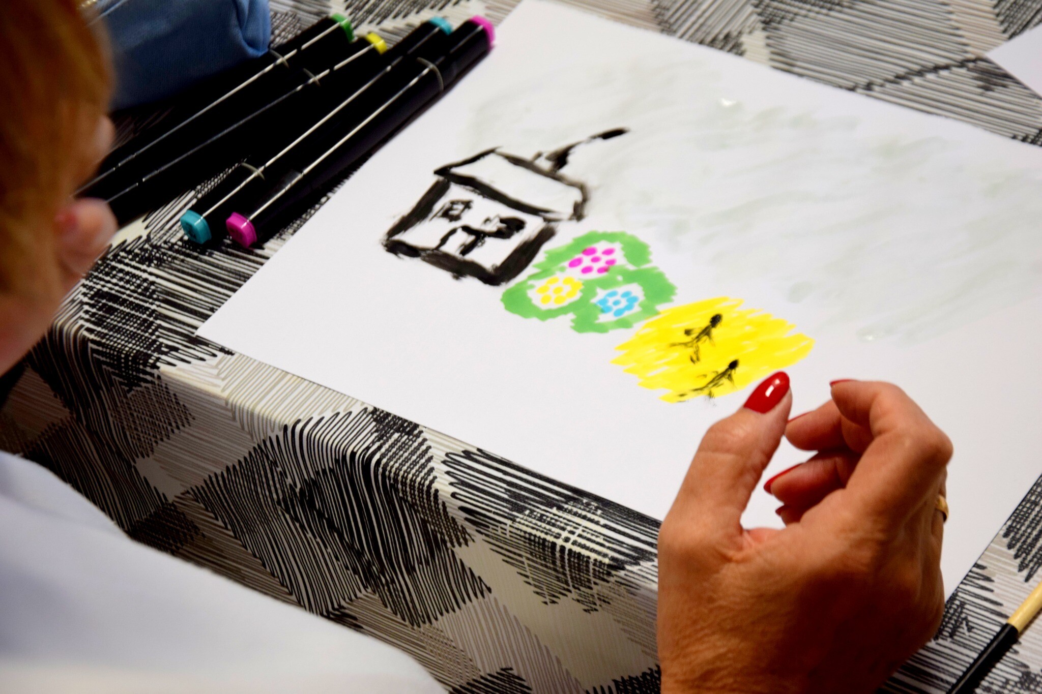 Po tej części przeszliśmy do działania bardziej cichego, ale nie mniej ważnego – warsztatu arteterapeutycznego, który poprowadziła doświadczona arteterapeutka Jola Królicka. Spotkanie to było okazją, by wejść w relację z materiałami plastycznymi, które będą towarzyszyć osobom uczestniczącym przez całą mobilność. W atmosferze swobody, spokoju i wzajemnego zaufania osoby uczestniczące zaczęły zaprzyjaźniać się z kolorem, fakturą, gestem i obrazem. Nie chodziło o naukę rysunku, ale o otwarcie – na detal, na siebie, na własną myśl i emocję. Jola, z dużą uważnością i wrażliwością, poprowadziła grupę przez ten pierwszy twórczy proces, uruchamiając w nich gotowość do pracy artystycznej jako formy opowieści o sobie i świecie. To był ważny moment – cichy, subtelny, ale niosący w sobie dużą moc.