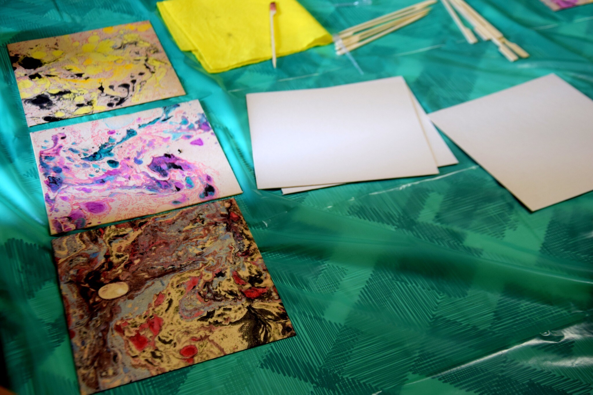 W innym dniu tworzyliśmy eko-farby z naturalnych pigmentów i projektowaliśmy kartki artystyczne z własnych marmurkowych arkuszy. Te działania, z pozoru proste, uczyły pokory wobec procesu i radości z przypadkowości.