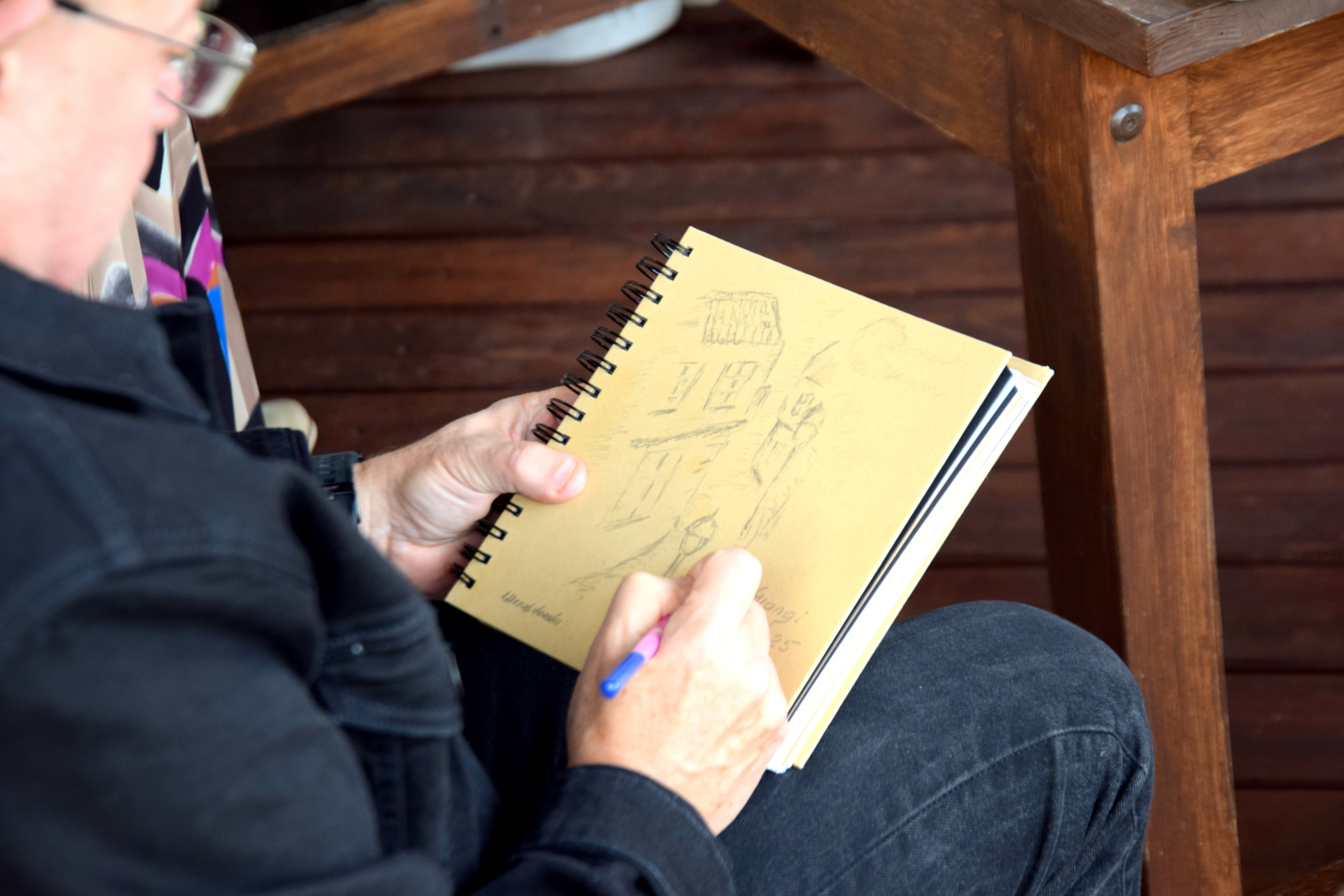 Tym razem pracowaliśmy z materiałami plastycznymi i szkicownikami, które będą osobistym narzędziem twórczym każdego uczestnika podczas podróży. Ćwiczyliśmy szkice, testowaliśmy kolor, rozpoznawaliśmy to, co w indywidualnym geście twórczym porusza, zatrzymuje, domaga się zapisu. Uczestnicy zaczęli formułować wstępne koncepcje i szukać tematów, które mogą stać się osią refleksyjnej pracy podczas mobilności – nie jako sztywny plan, ale jako punkty zaczepienia, wokół których będzie można budować obraz, notatkę, gest czy pytanie. Wszystko to – podobnie jak ostatnim razem – odbywało się w zieleni ogrodu MSK przy ul. Krzemienieckiej w Łodzi, gdzie natura dopełniała proces i nadawała mu właściwy rytm.